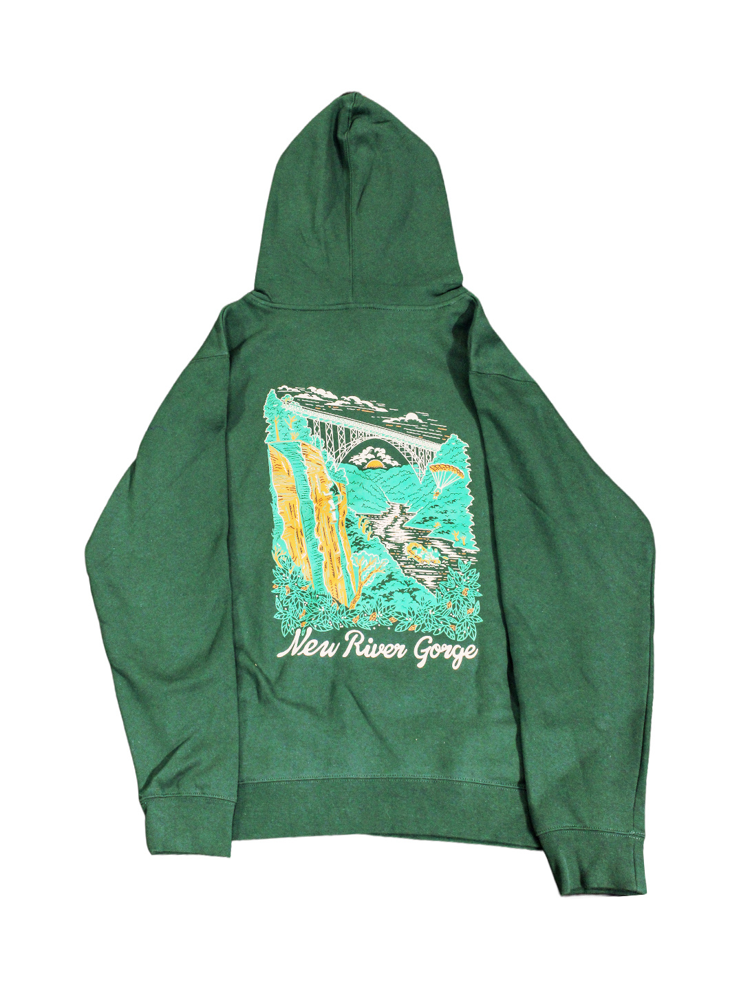 This warm (80% cotton/20% polyester) hoodie has a beautiful graphic showing the iconic New River Gorge activities.